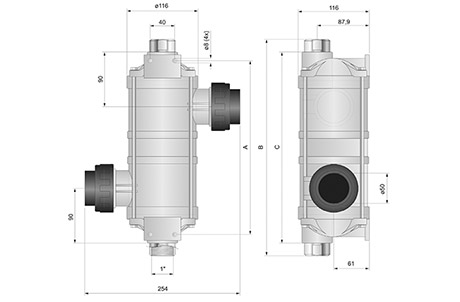 Gehäuse aus glasfaserverstärktem Kunststoff, Heizelement aus säureresistentem Edelstahl V4A/AISI 316, Klebeanschluss für Ø 50 mm Rohrleitung, inkl. Halterung.